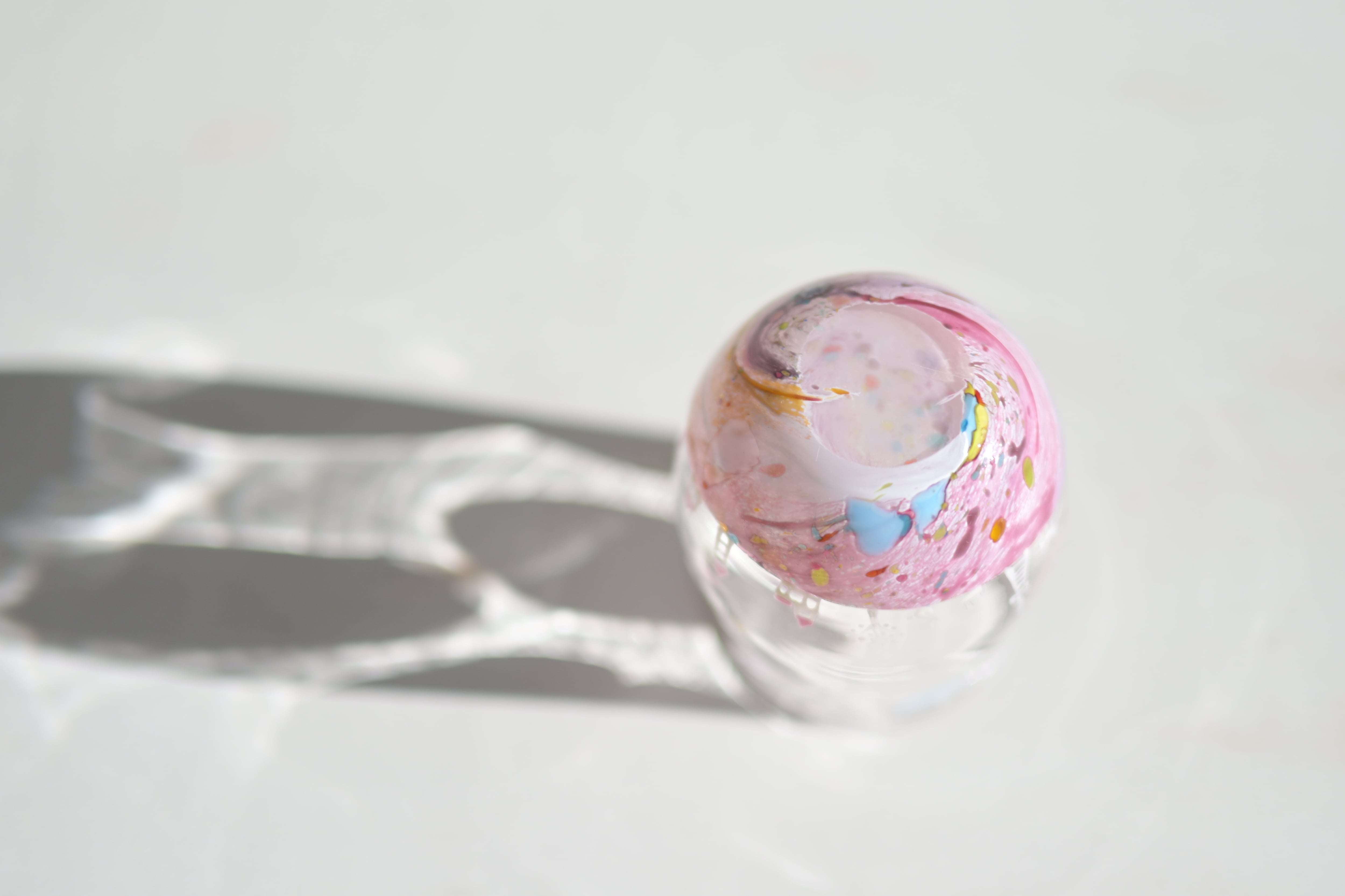 下の部分の色をつけるときに 透明なガラスに色ガラスの塊をつけ 茶巾絞りのように絞り切りながら色ガラスを溶着するために底の方にシワのように見えるところがあります。